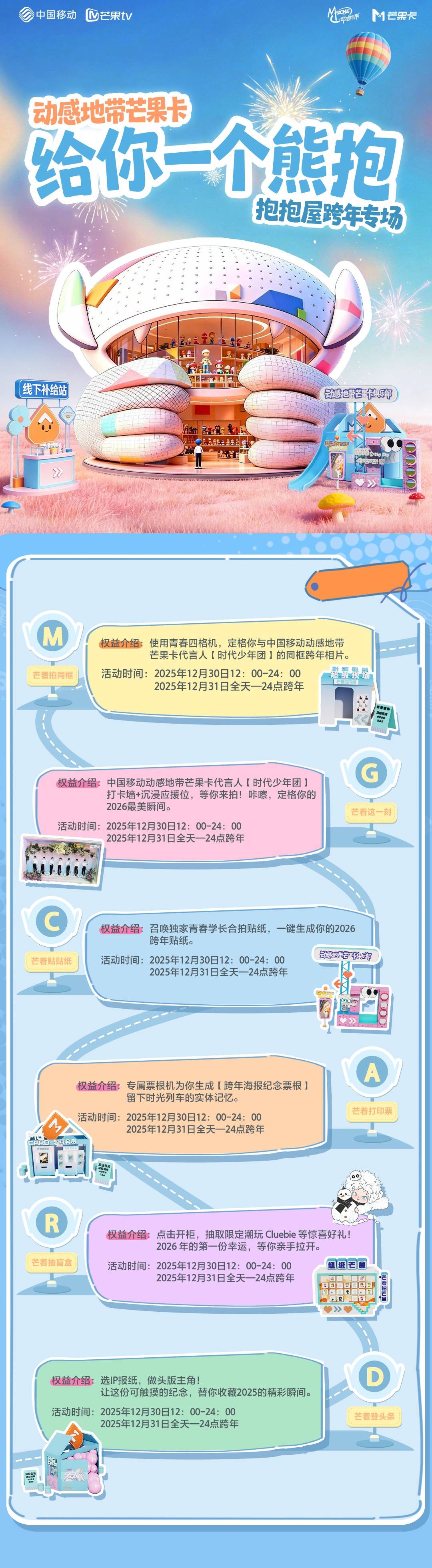 跨年不迁就,高兴要“抱”紧!12月30——31日,动感地带芒果卡「抱抱屋」等你来打卡!海口站仅仅「抱抱屋」的起点,等待未来动感地带芒果卡带着Cluebie、芒系IP和演员周边,解锁更多城市,带来更多惊喜与好礼!这个跨年,咱们不见不散!